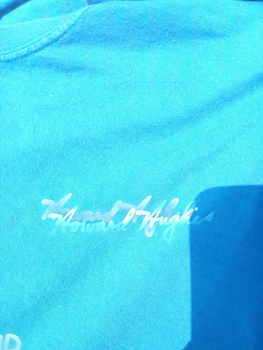 The infamous Anchorpus Caleb Fraid logo on this light blue XL t-shirt. This one is especially unique - with its “Howard Hughes” label on the front and back (apropos!), one of a kind! The purchase comes with a free download of your choice (will email you a code after purchase)!